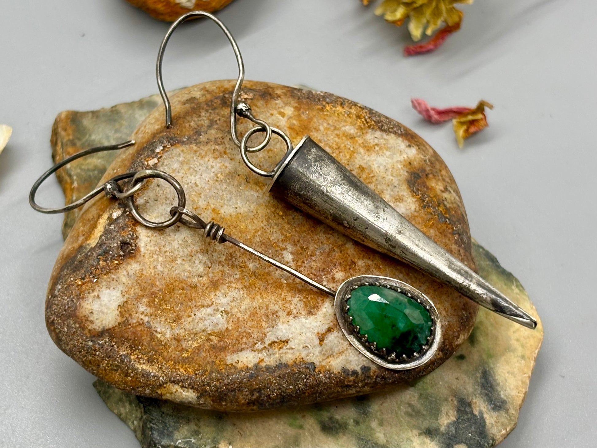 Asymmetrical style earrings with a hand formed cone made from a sheet of sterling silver, for a pop of color I chose an emerald gemstone