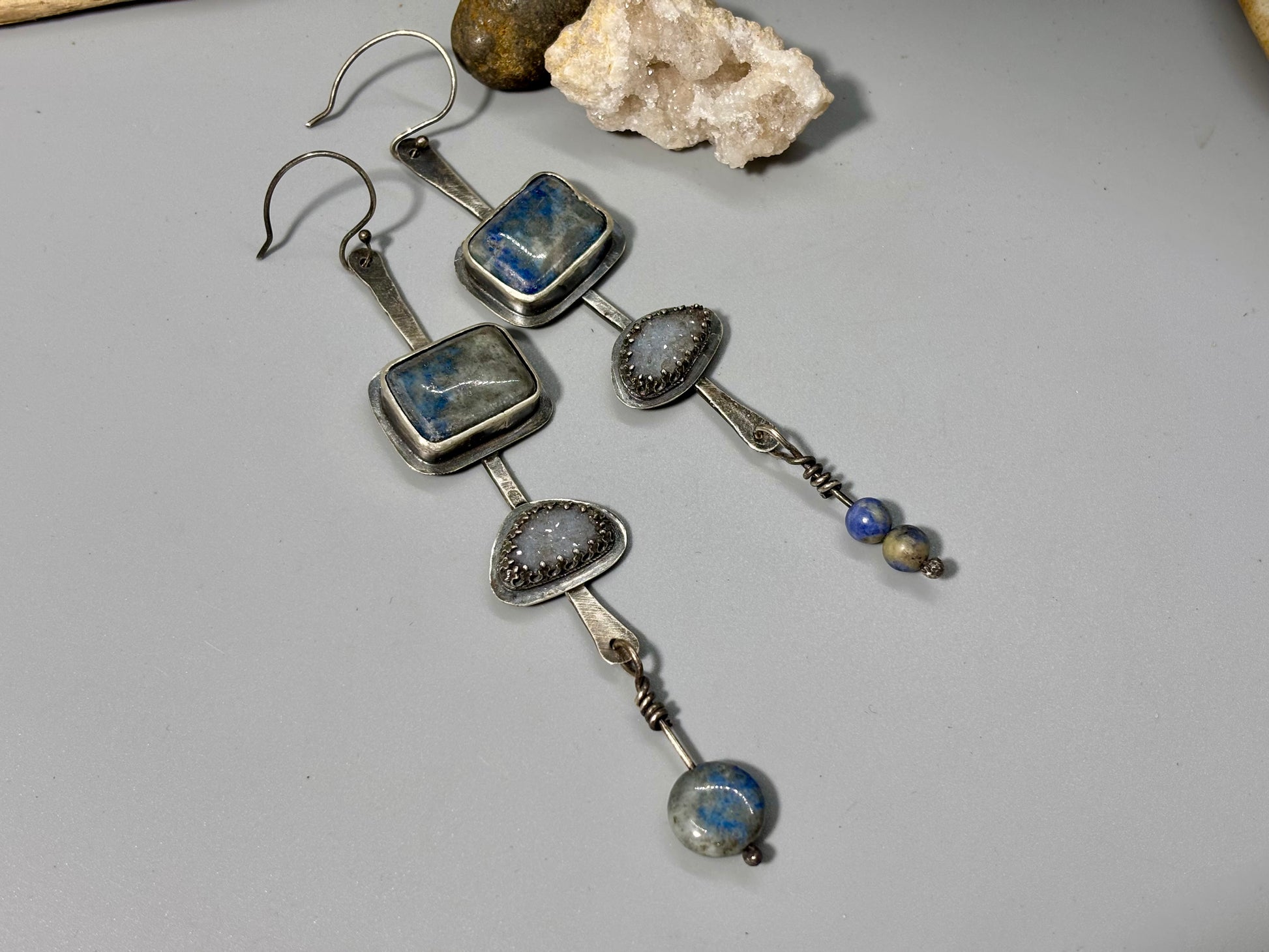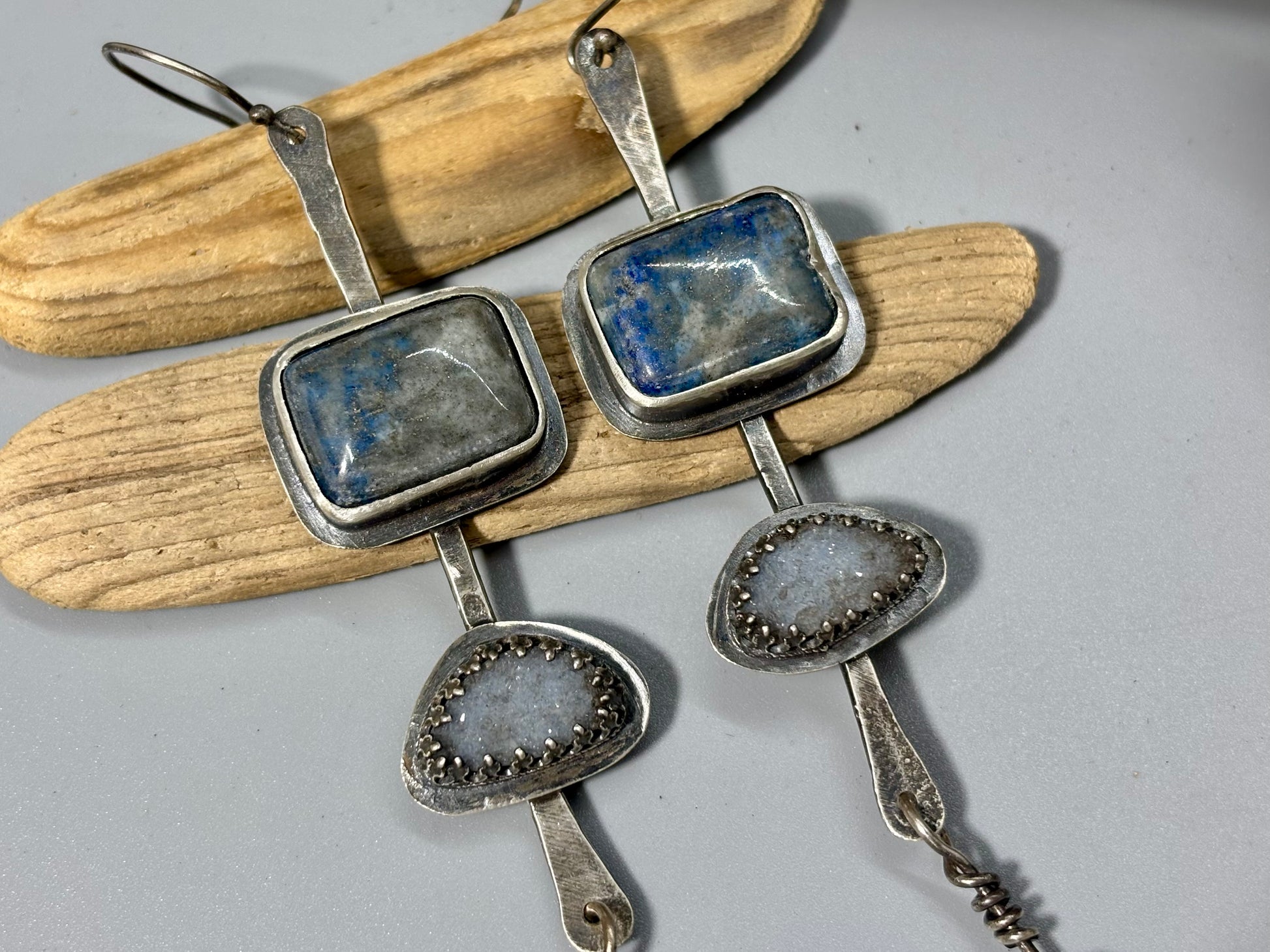 Sterling Silver Lapis Druzy Dangling Earrings.